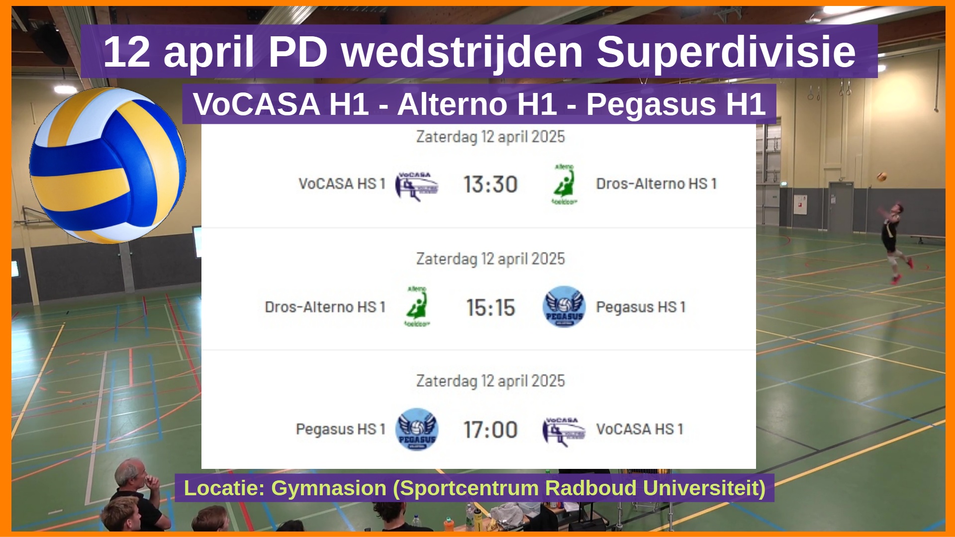 Wie gaat en wie blijft in de Superdivisie? Aanstaande zaterdag (12 april) wordt er gestreden om 2 plekken in de Superdivisie. Gastheer VoCASA H1 ontvangt Dros-Alterno H1 (Apeldoorn) en Pegasus H1 (Nijmegen). Gespeeld wordt in het Sportcentrum van Radboud Universiteit.