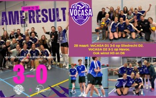 VoCASA Dames1 3-0 op Sliedrecht2. Dames2 3-1 op Havoc. Ook winst H3 en D6 op 28 maart