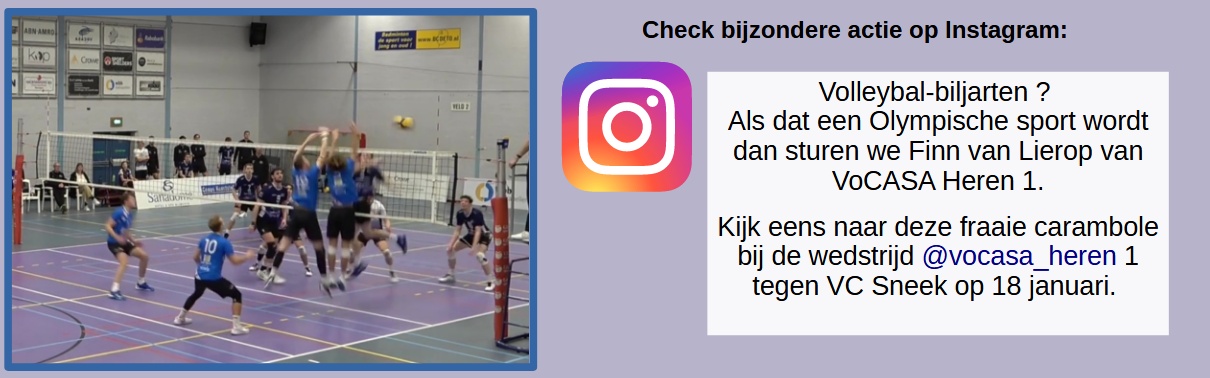 Voor wie toevallig de volleybalhal van VoCASA binnenliep even en een bakkie troost wilde nemen, zal ongetwijfeld laat thuis zijn geweest. Verantwoordelijk daarvoor waren de heren van VoCASA en VC Sneek die het publiek een uiterst enerverende vijfsetter voorschotelden waarbij de gasten in de vierde set op 24-22 twee matchpoints ongedaan maakten en na vijf sets juichend de douches op konden zoeken. “Een mooie overwinning”, aldus trainer/coach Patrick Koelemij met gevoel voor understatement.