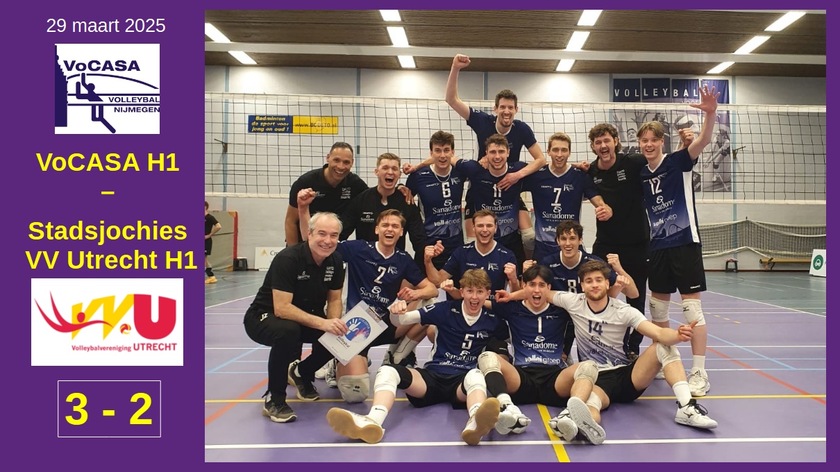 De mannen van VoCASA Heren1 hebben zaterdagavond (29 maart) met 3-2 gewonnen van Stadsjochies VV Utrecht H1. In een goedgevulde hal werd in zinderende sfeer een prachtige pot volleybal gespeeld.