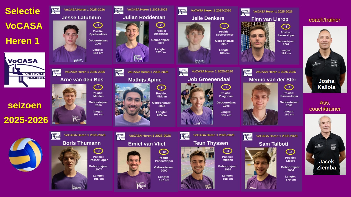 VoCASA H1 2025-2026: Naam – Shirtnummer – positie – geboortejaar – lengte