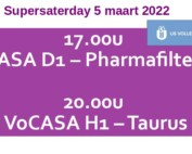 Zaterdag 5 maart is een dag waarop zowel VoCASA D1 als VoCASA H1 thuis speelt. VoCASA Dames 1 om 17.00u tegen Pharmafilter US, nr 2 in de Topdivisie. VoCASA Heren 1 om 20.00u tegen Taurus, nr 4 in de Eredivisie. We noemen zulke (zeldzame) dagen "SuperSaterday". Voor de paarse fans zijn deze dagen een prettige aanleiding op lang in de VoCASA-hal te verblijven. Eindelijk mag ook de bar langer open, zodat de ambiance voor samen genieten van topvolleybal en bijpraten met clubgenoten, vrienden, fans en zakelijke contacten ideaal is. Programma VoCASA-hal, Supersaterday 5 maart 2022 12:00 VoCASA JA 1 Gemini [...]