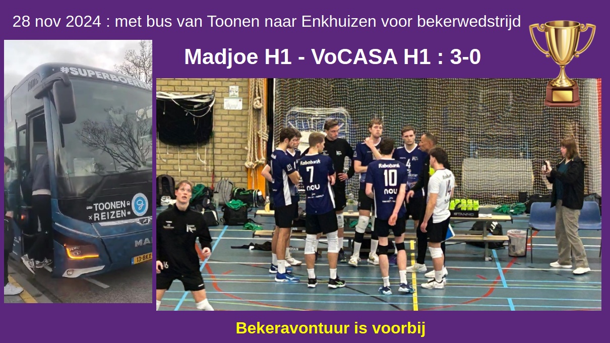 De mannen van VoCASA H1 (Superdivisie) hebben donderdag 28-november met 3-0 verloren Madjoe H1 (Topdivisie). Setstanden 25-20, 25-21 en 25-23. Aan de busreis heeft het niet gelegen. Het team werd vakkundig naar Enkhuizen gebracht door Machtilda van Dam van Toonen Reizen. Enkhuizen 28 nov 2024 : Madjoe-VoCASA, 3e ronde beker heren In de eerste set werd VoCASA gelijk op een achterstand gezet (9-3) maar kwam terug naar 10-10. Vervolgens wisselde het af. Bij een stand van 21-20 leek de set ook nog allerzins in het voordeel van de Nijmegenaren uit te kunnen pakken, maar in het eindspel trok Paars aan [...]