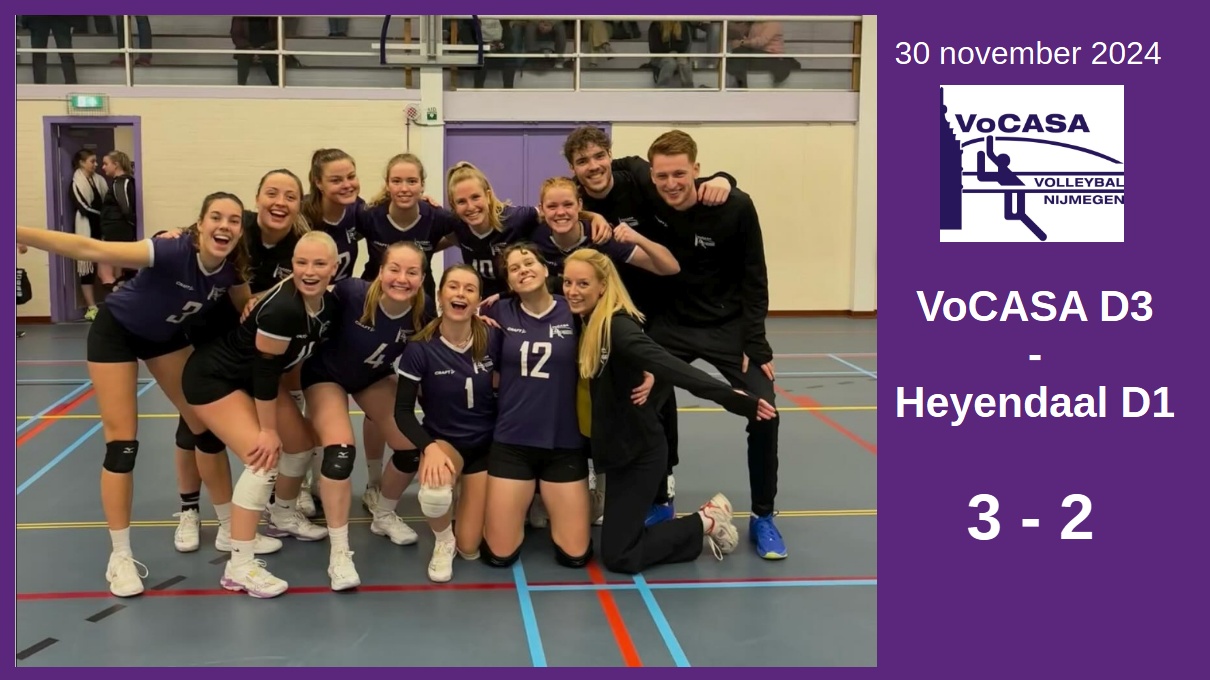 De stadsderby van 30 november VoCASA Dames 3 tegen Heyendaal Dames1 werd vandaag een 5-setter. Het was een flinke uitdaging voor de paarse dames. De dames van VoCASA begonnen super sterk in de 1e set met een muur van een blok. Het werd 25-13. Daarna werd het hard werken: 25-23 in set2. Set 3 en 4 waren voor de tegenstander: 19-25 en 22-25. Gelukkig sleepte het team de 5e set met volle overtuiging binnen (15-4). Dames 3 blijft meestrijden bovenin 3e Divisie Met 2 wedstrijden minder dan Dros-Alterno, en 1 minder dan Hevo, staat VoCASA D1 in [...]